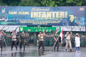 Bupati Barru Andi Ina Kartika Sari menghadiri kegiatan hari juang Infanteri ke 77 tahun Jumat 19 Desember 2025 di lapangan M.Jusuf Kodam XIV Hasanuddin dengan tema mewujudkan prajurit dan satuan Infanteri yang Prima bersama dengan rakyat dalam rangka melindungi tugas pokok Tentara Nasional Indonesia (TNI) Angkatan Darat (AD).