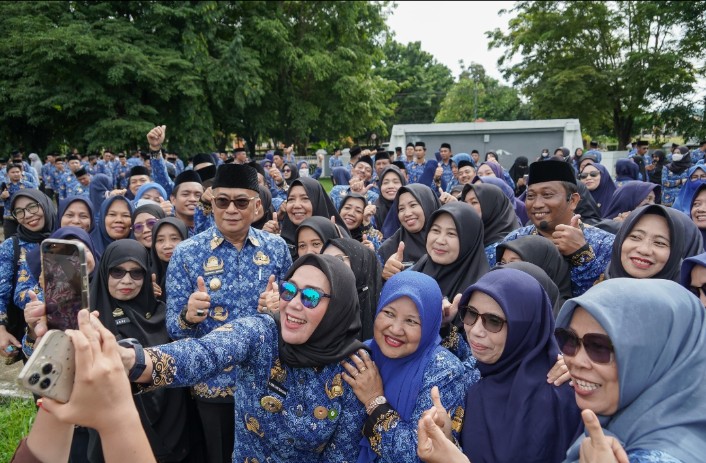 Dalam suasana penuh kedekatan, Bupati dan Wakil Bupati kemudian menyapa para peserta upacara, berbincang ringan dengan sejumlah ASN, dan melaksanakan sesi foto bersama sebagai bentuk penghargaan atas dedikasi mereka.
