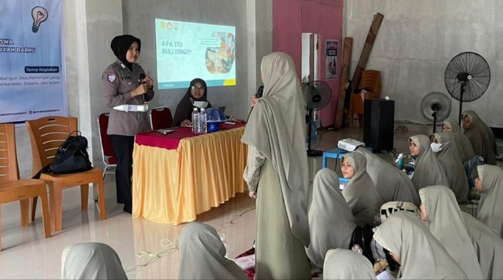 Barru – Personel Polisi Wanita (Polwan) Polres Barru melaksanakan kegiatan sosialisasi anti perundungan di SMP Putri Al Wahdah Islamiyah Barru, Kamis (8/1/2026). Kegiatan bertujuan untuk memberikan pemahaman sejak dini kepada pelajar tentang bahaya perundungan atau bullying, baik secara fisik, verbal, maupun melalui media sosial.